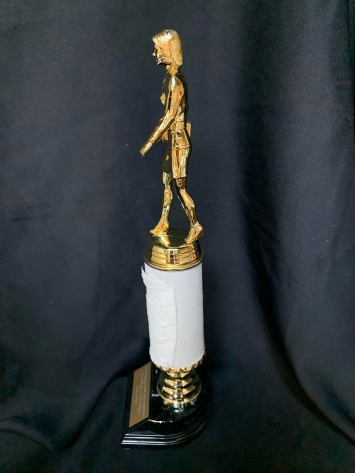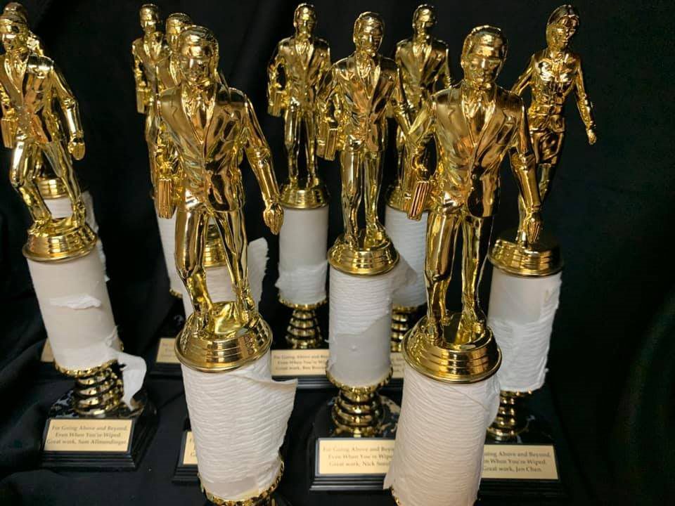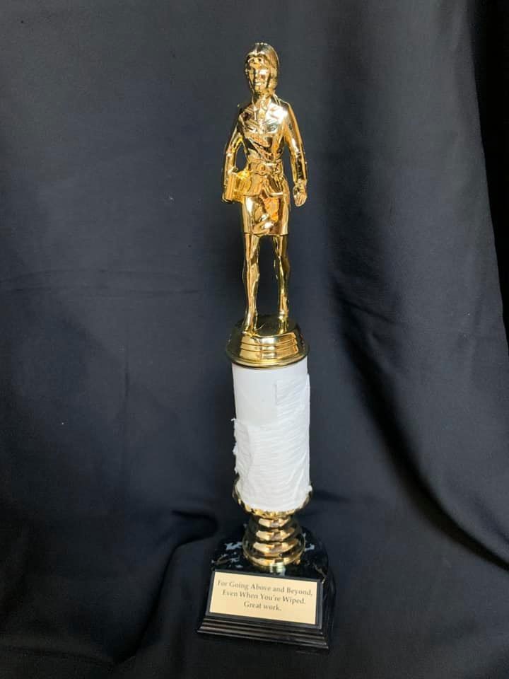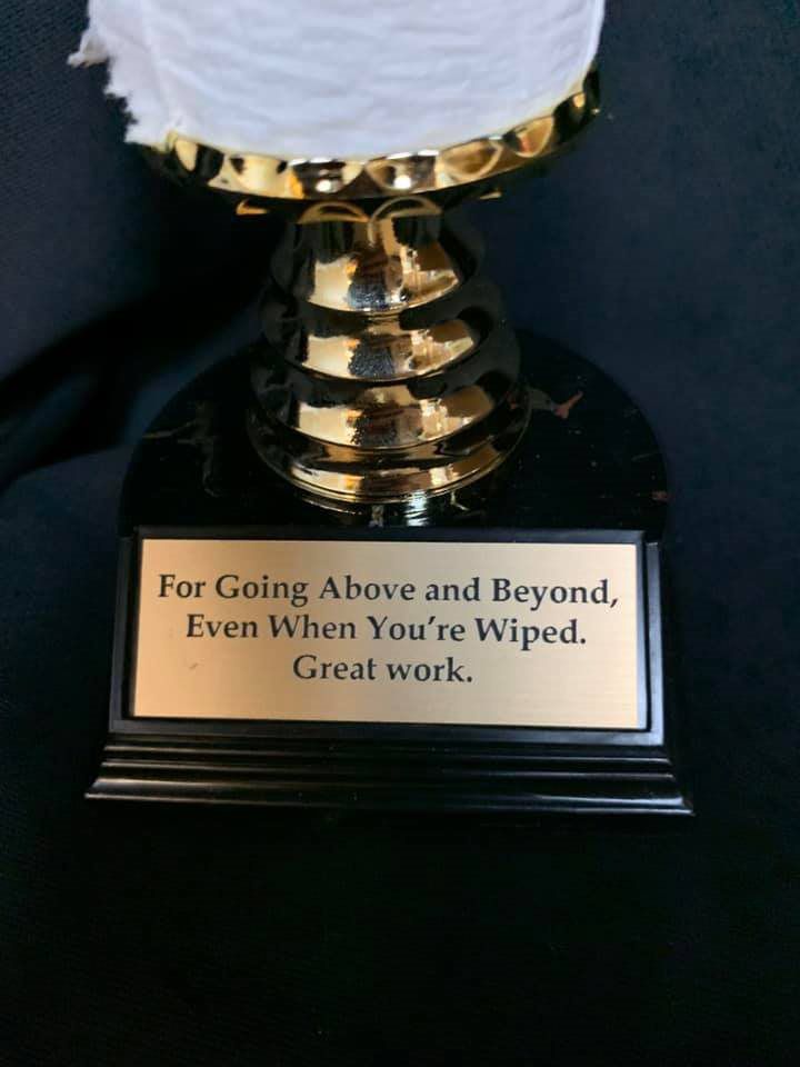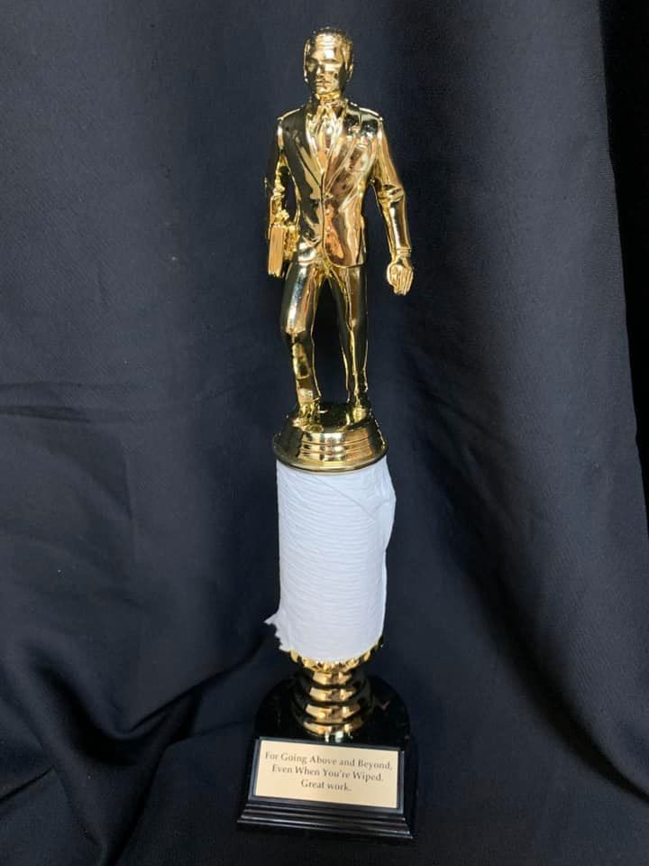 Unique Fun award based on "The Office" Dundee Award. Toilet Paper rolls replace the columns to add a unique and funny possible reference to pandemic and or potty humor. All in good fun!